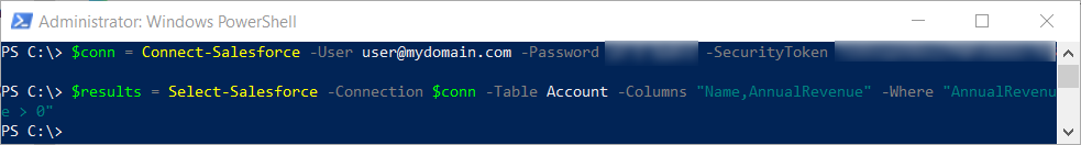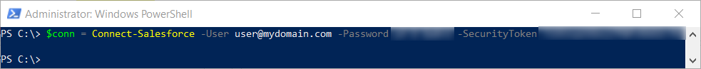 $conn = Connect-Salesforce -User $user -Password $pwd -SecurityToken $sectoken