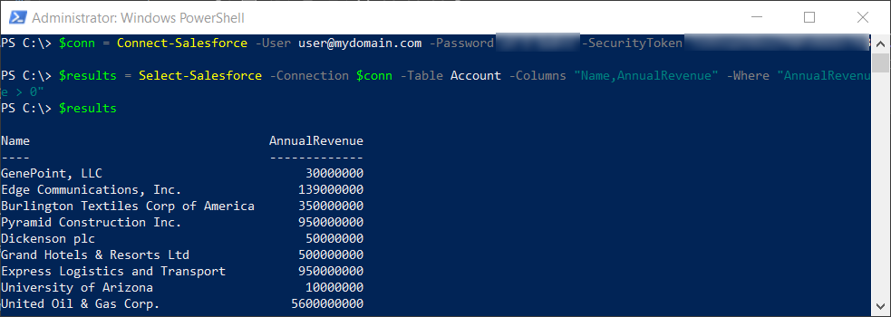 $results = Select-Salesforce -Connection $conn -Table Account -Columns "Name,AnnualRevenue" -Where "AnnualRevenue > 0"