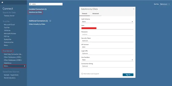 - 認証と接続:Tableau で接続ペインを開き、Salesforce by CData を選択します。Basic またはOAuth 2.0 で認証します