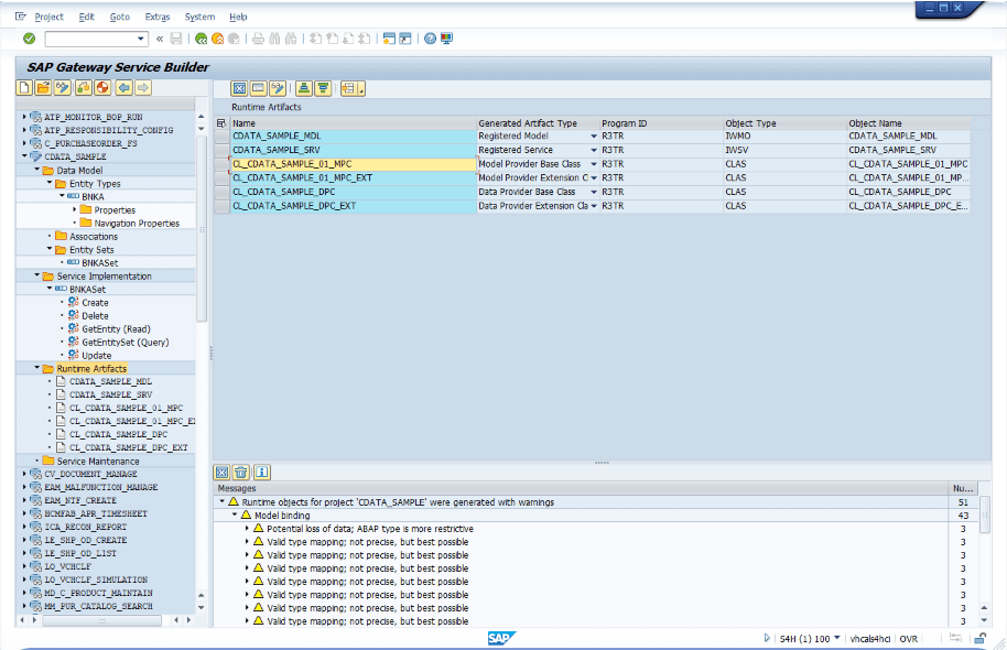 生成が完了すると、Runtime Artifacts が追加されます。これらは実装クラスと OData サービス登録用のクラスを定義しています。