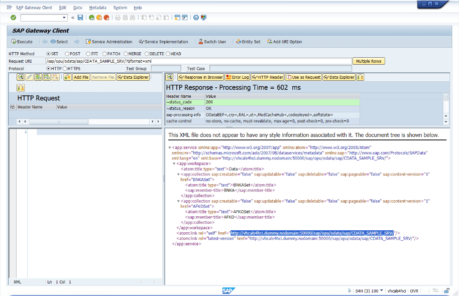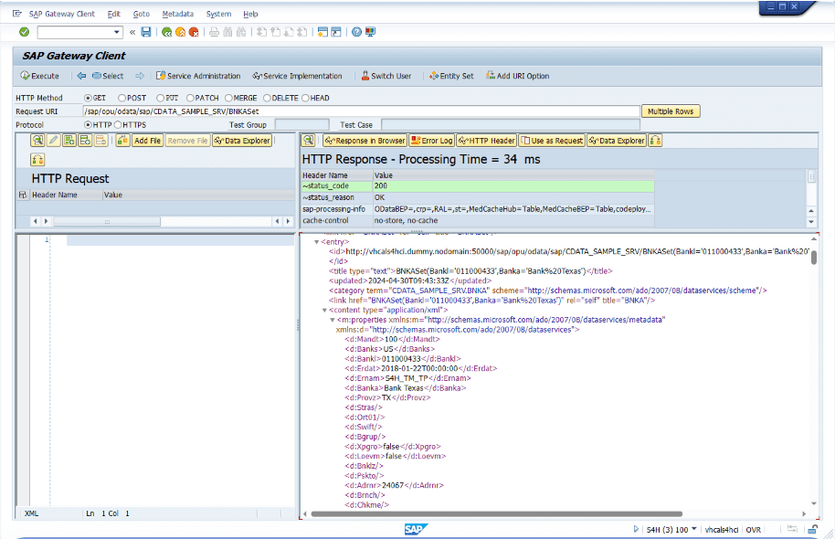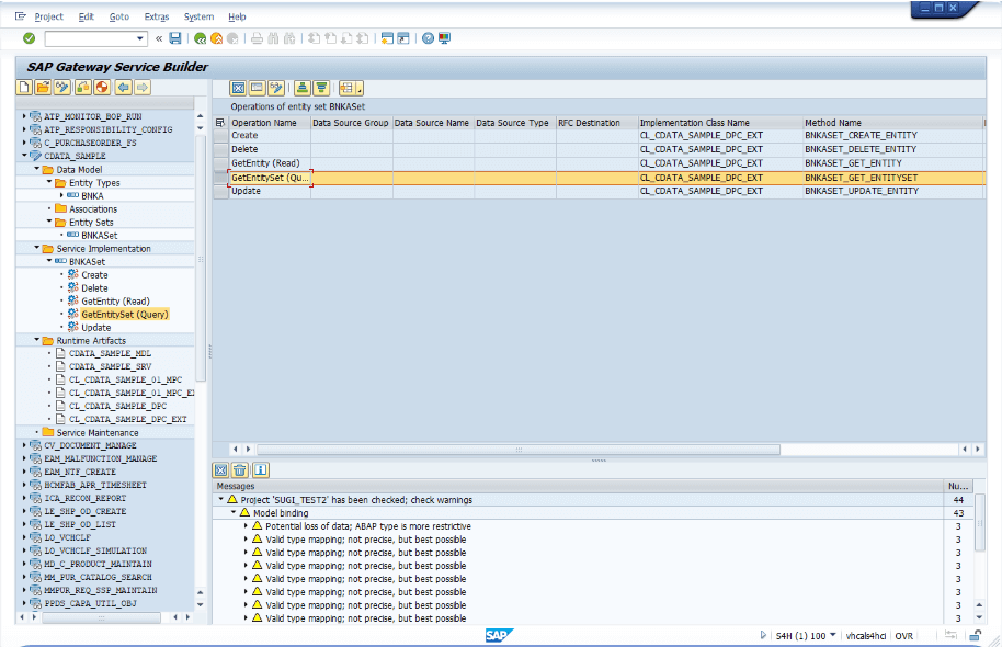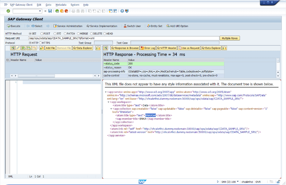 「/CDATA_SAMPLE_SRV/BNKASet」を呼び出すことはできますが、GetEntitySet の内部実装が完了していないため、まだ実際のデータは取得できません。次に、GetEntitySet の内部ロジックを実装します。