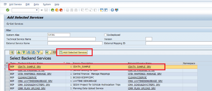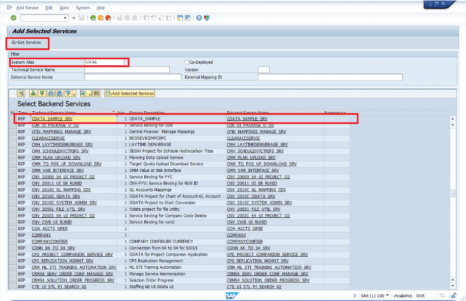 System Alias を選択し、Get Services をクリックします。SAP Gateway Service Builder で Runtime Artifacts として登録されたサービスが表示されます。