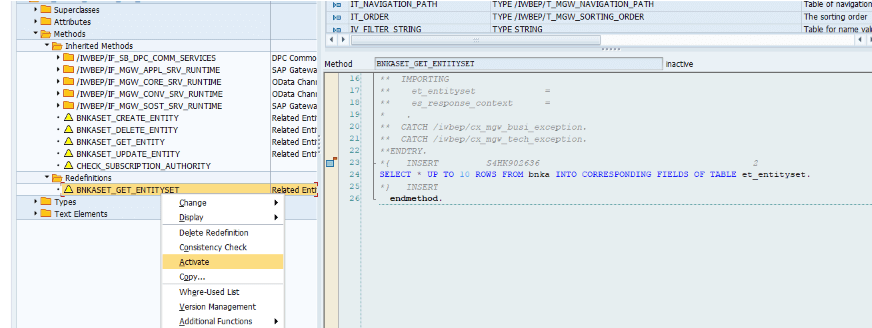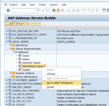 SAP Gateway Service Builder に戻り、内部ロジックを実装します。BNKA の Service Implementation にある「GetEntitySet (Query)」を右クリックし、「Go to ABAP Workbench」をクリックします。