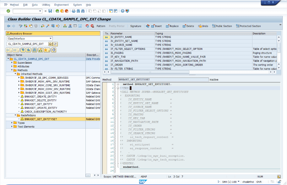 「BNKASET_GET_ENTITYSET」の内部実装コード画面が開き、ABAP の実装を進めることができます。