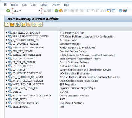 ログイン後、トランザクションコード「SEGW」を入力して SAP Gateway Service Builder 画面を開きます。ここで OData サービスを実装していきます。