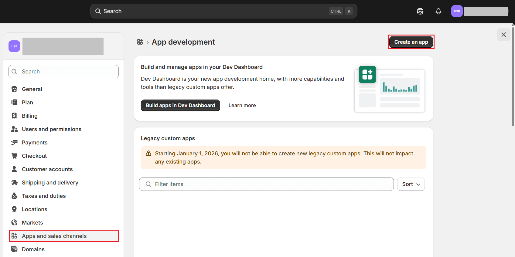 - 設定 → アプリと販売チャネル → アプリを開発に移動します。