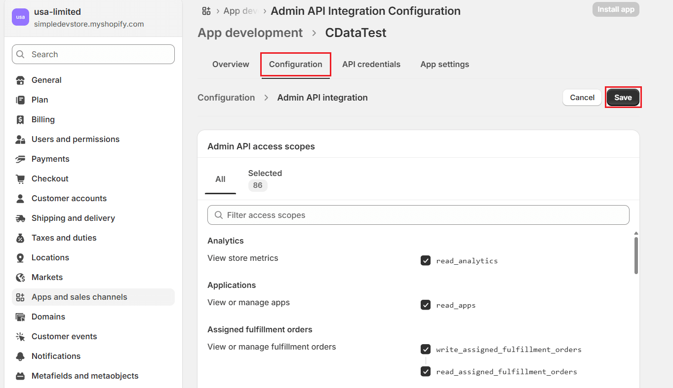 - Admin API スコープを設定に移動し、必要な権限(例:read_products、read_orders、write_customers)を選択します。