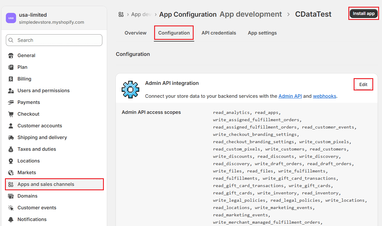 CData Shopify JDBC ドライバーで Shopify に接続するには、まず Shopify ストアでカスタムアプリを作成する必要があります。