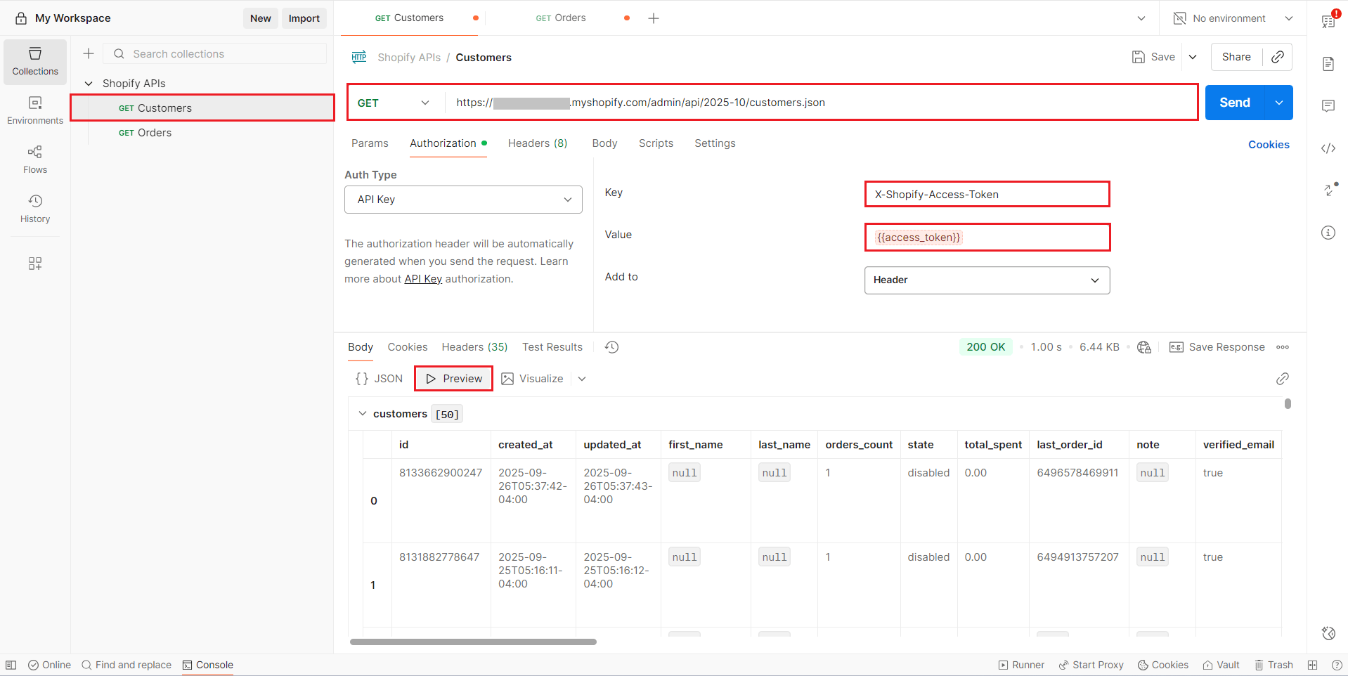 Admin API アクセストークンを取得したら、それを使用して Shopify ストアに認証済みの API リクエストを送信できます。この例では、Postman を使用してシンプルなリクエストを送信し、顧客リストを取得します。