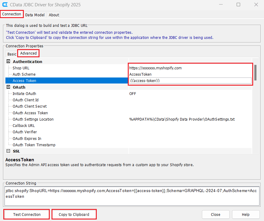 jdbc:shopify:ShopURL=https://yourshopname.myshopify.com;AccessToken=myaccesstoken;Schema=GRAPHQL-20XX-XX;AuthScheme=AccessToken;