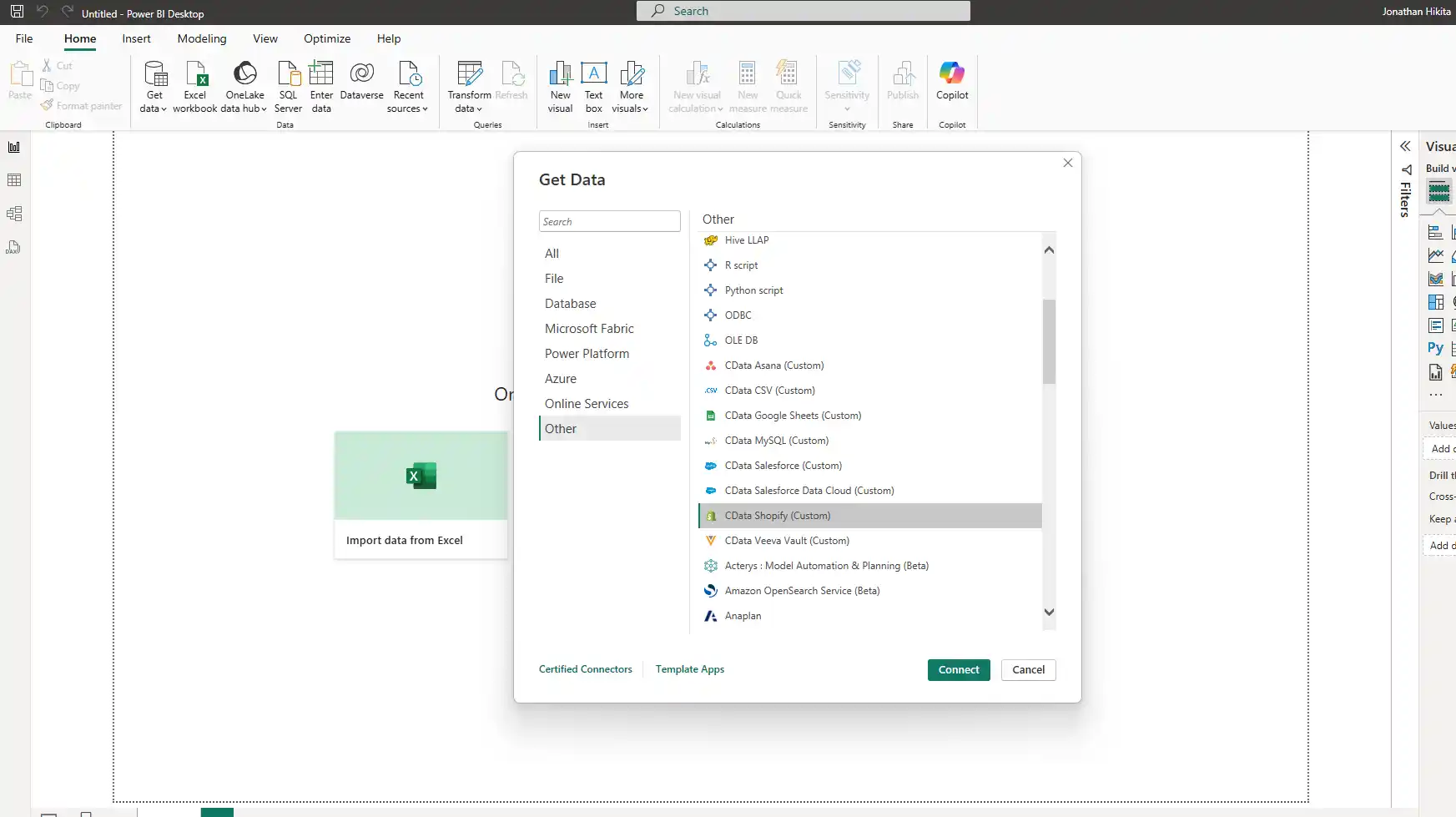 この後の操作は、Power BI から Shopify に接続する場合と全く同じです。データソースとして「CData Shopify」を選択します。