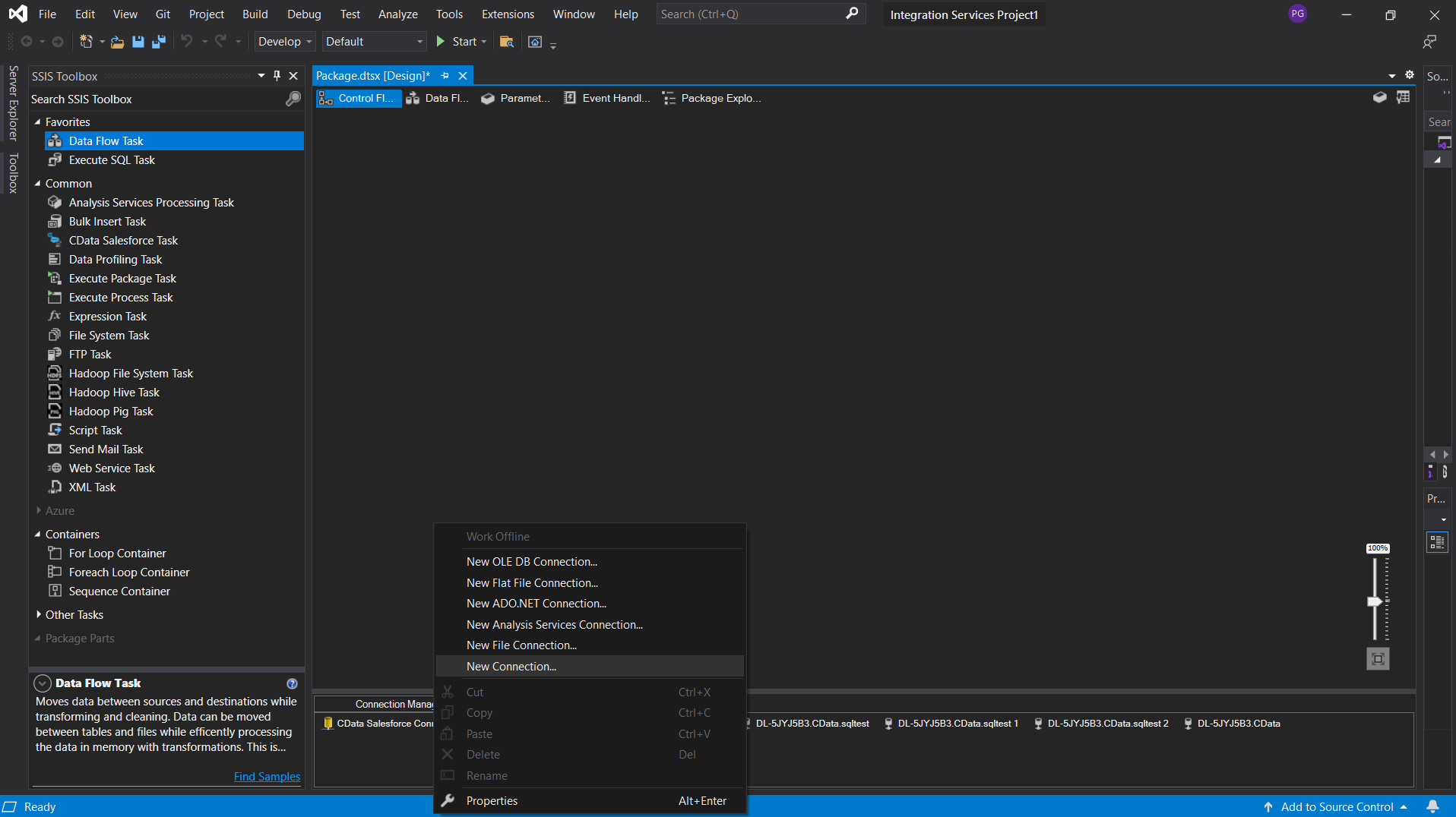 Microsoft Visual Studio で、Integration Services Project の下部パネルを右クリックし、「新しい接続...」を選択します。