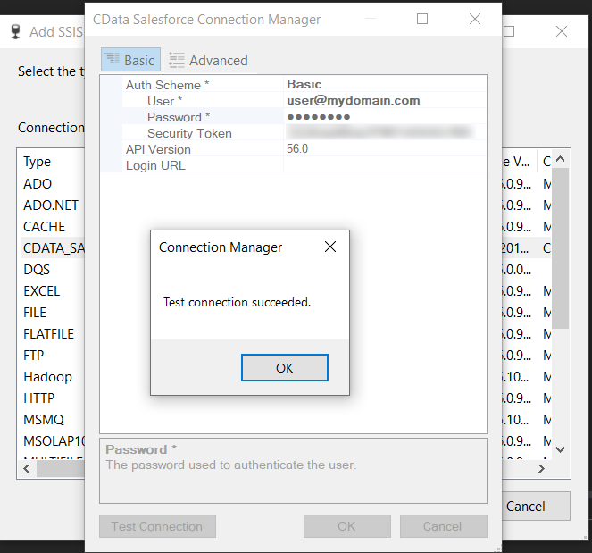 Auth Scheme で「Basic」を選択し、接続情報を入力します。次に、「接続テスト」をクリックします。「OK」をクリックします。
