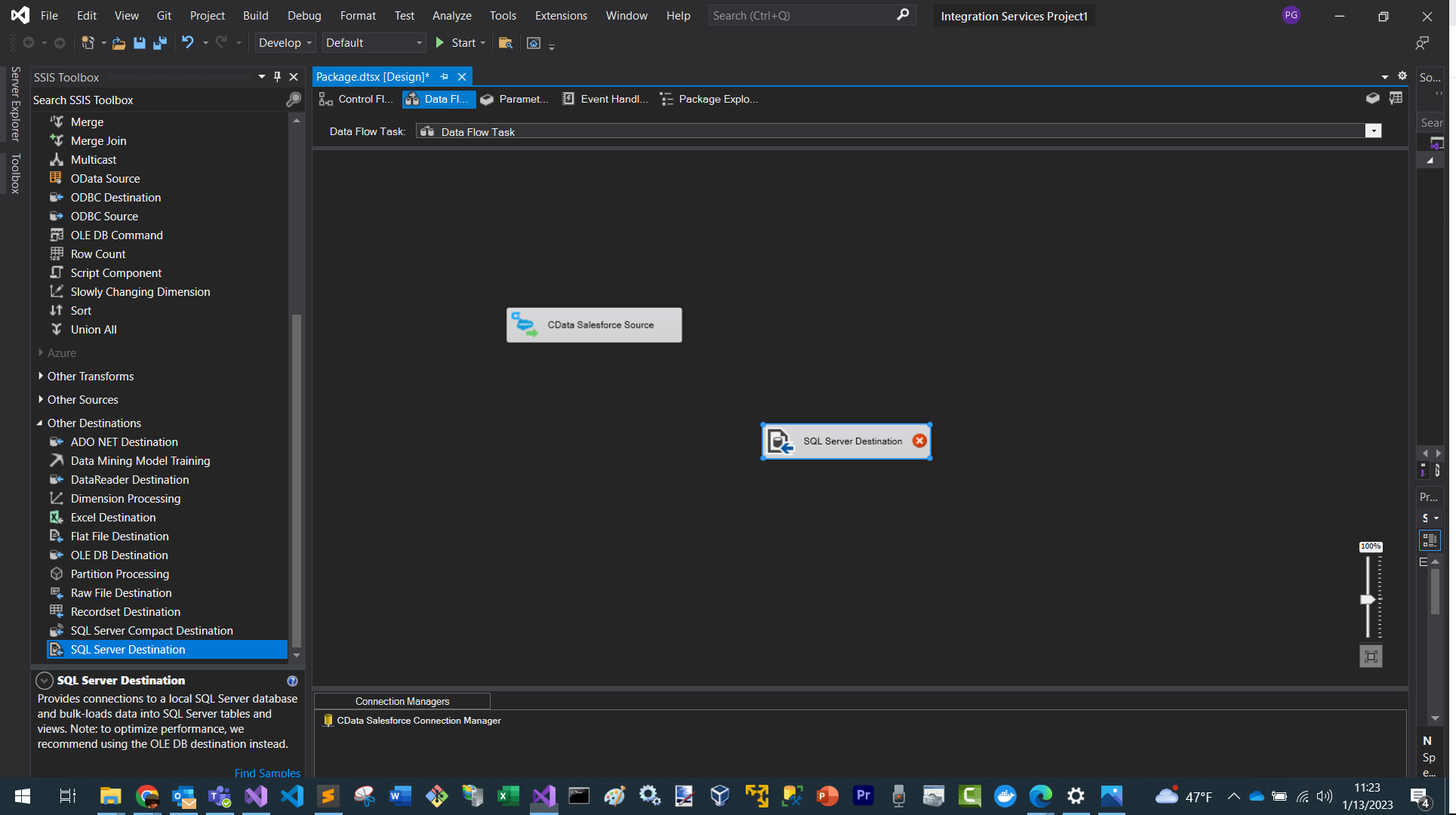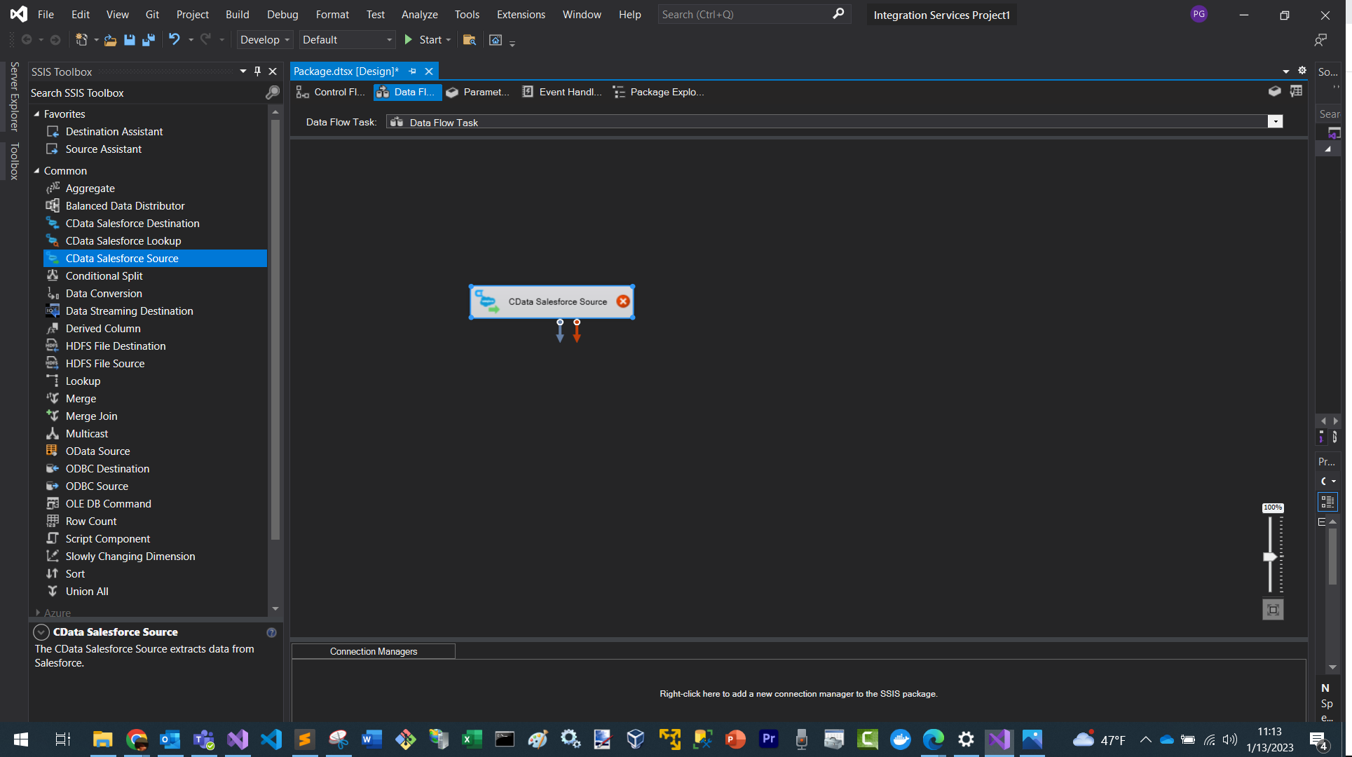 データフロータスク内に、CData Salesforce ソースコンポーネントをドロップします。