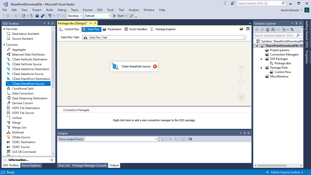 SQL Server SSIS 内で SharePoint Data Provider をすぐに使い始めるには、完全に機能する サンプルパッケージをダウンロードしてください。デモを実行する前に、「Connection Manager」で接続の詳細を変更する必要があります。