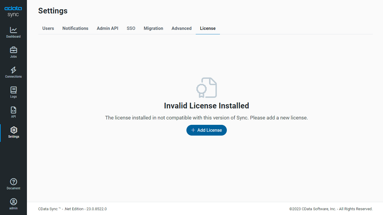 - 次に、CData Sync をインストールします。 インストールが完了すると、ブラウザでログインページが自動的に開きます。 開かない場合は、ブラウザでログインページ(デフォルトでは localhost:8019)にアクセスしてください。