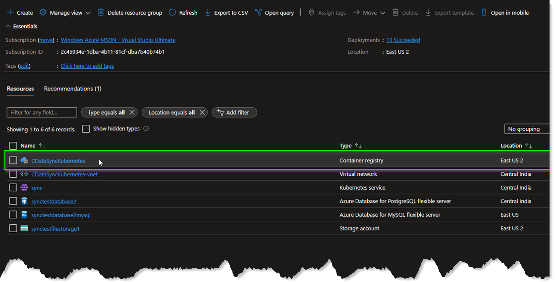 - Navigate to your resource group in the Azure Kubernetes Service and locate the container registry. You need this registry to retrieve the login server.