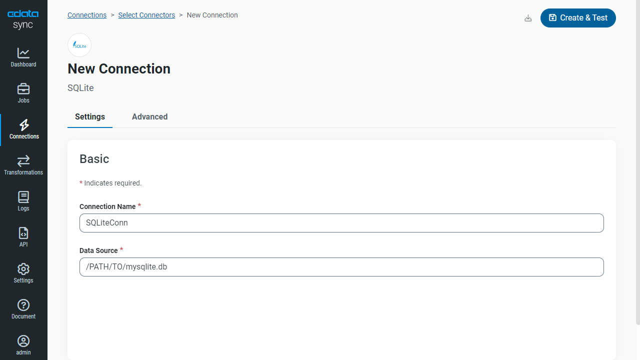 - 続いて、再度「+Add Connection」をクリックし、「Destinations」から「SQLite」を選択します。レプリケーション先データベースの接続プロパティを入力します。