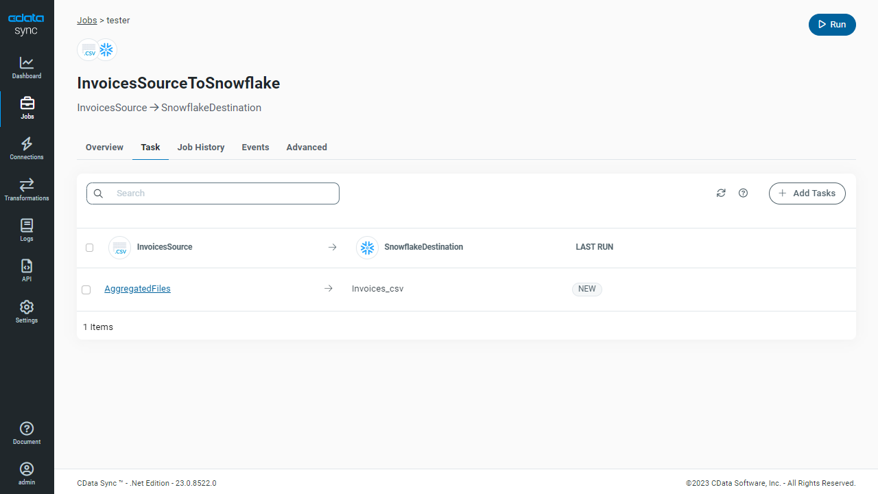- ジョブに名前を付け、先ほど作成した CSV ソースと Snowflake 同期先の接続を選択します。