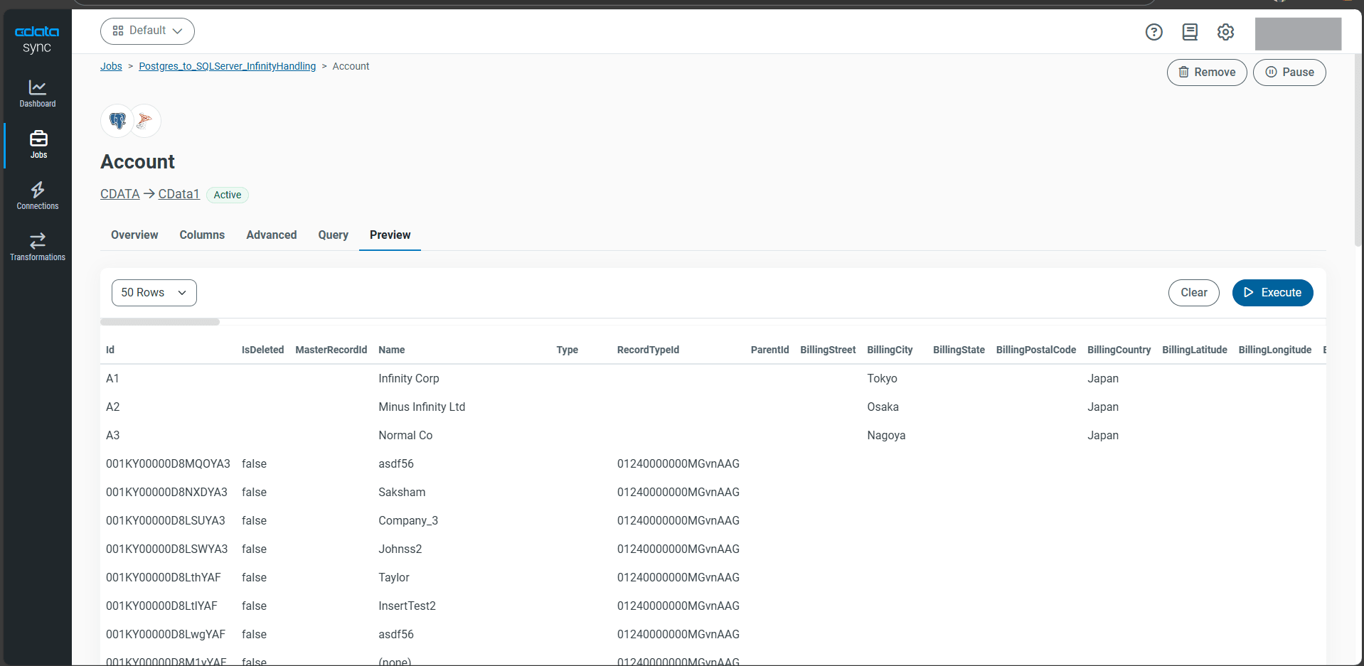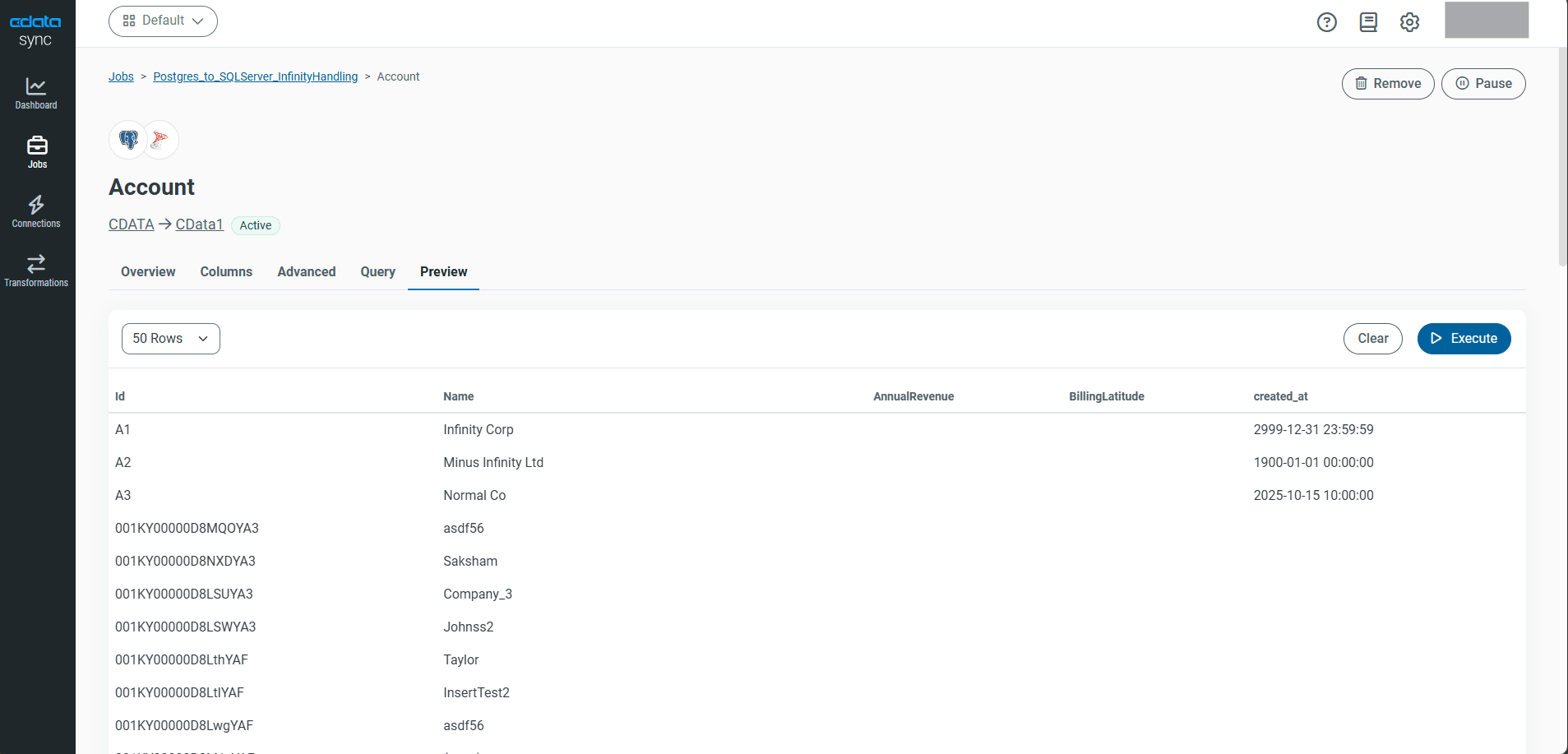 CData Sync は、設定オプションやカスタムクエリを使用して、これらの特殊な無限大値を標準的な有限値に変換できるため、この問題を解決します。これにより、システム間でスムーズなデータ統合が可能になります。