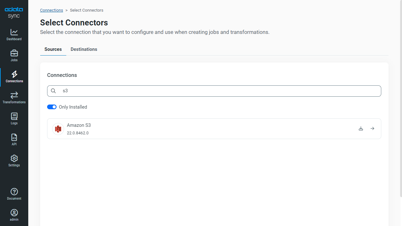 Amazon S3 の設定と CData Sync の接続が完了したら、エンタープライズデータを Amazon S3 にレプリケーションする準備が整いました。レプリケーションしたいデータソースに対して、ソース接続を設定します。CData Sync には多数のデータソースが組み込まれていますが、新しいデータソース接続を簡単にダウンロードすることもできます(CData Sync アプリ内のリンクをクリックするか、データソース接続のダウンロードページに直接アクセスしてください)。
