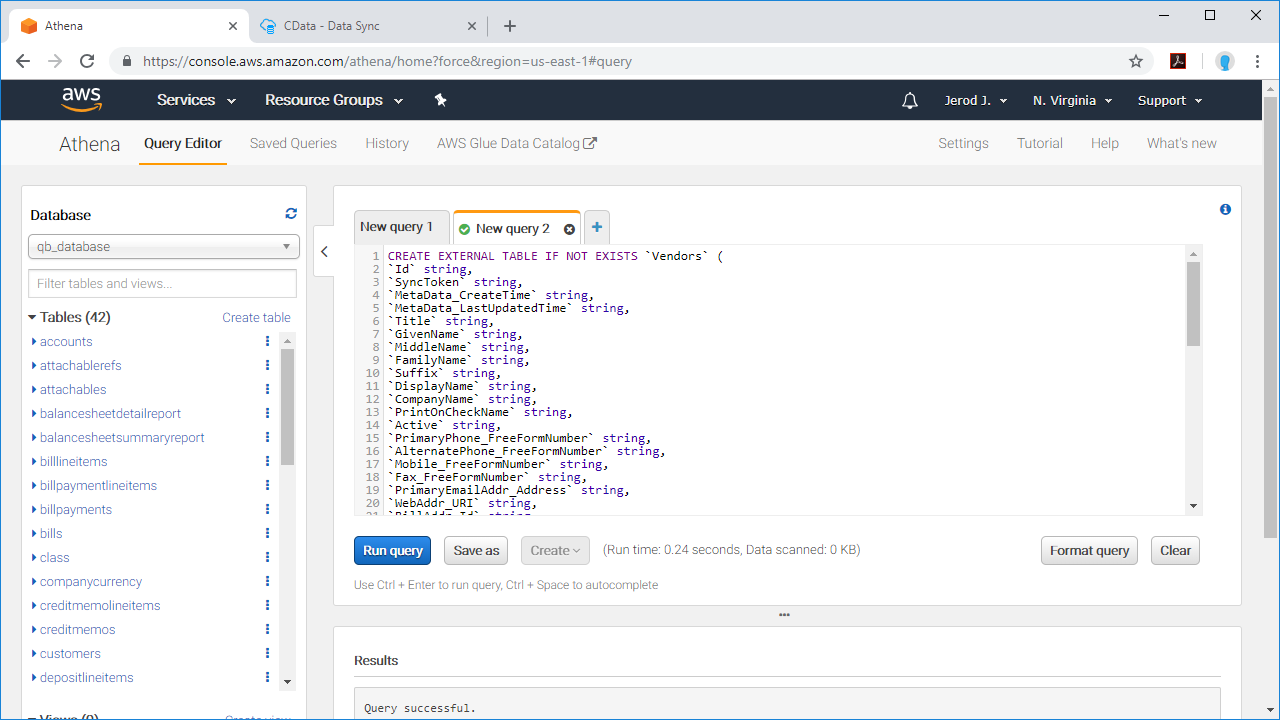 データベースを選択したら、Hive DDL ステートメントを実行して外部テーブルを作成します。これにより、Amazon Athena 接続をサポートする任意のツール、アプリケーション、プラットフォームからレプリケーションデータをクエリできるようになります。