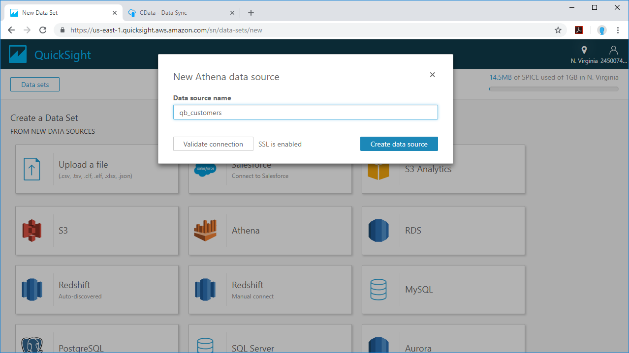 Amazon QuickSight は、Amazon Athena データベースへの接続と可視化をネイティブでサポートしています。レプリケーションデータの可視化を開始するには、Amazon QuickSight コンソールに移動し、「新しい分析」をクリックし、「新しいデータセット」をクリックします。データセットメニューで Athena を選択し、データソースに名前を付けて、「データソースを作成」をクリックします。