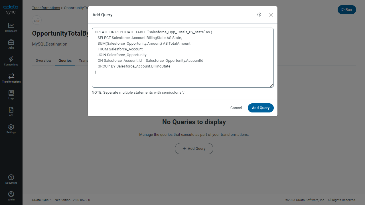 - 次に、メイン接続ページから「Queries」タブをクリックします。 レプリケーションされたデータを変換するための SQL クエリを入力します。 この例では、Salesforce テーブルを結合し、各商談(Opportunity)に関連付けられたアカウントの請求先都道府県ごとに、すべての商談の合計金額を集計します。入力したら、「Add」をクリックします。