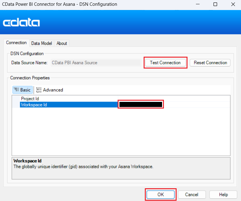 Click OK to complete the connection. Note down the DSN or Data Source Name (the default is "CData PBI Asana Source") as you will use it in the next section.