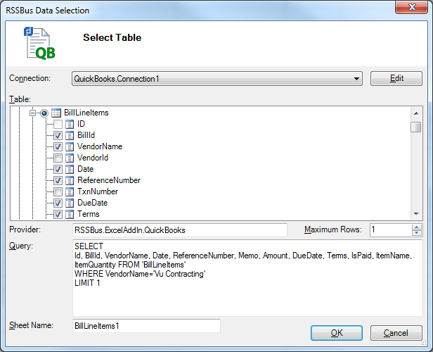 - Connect to your QuickBooks company file and select the information that you would like to send. This example uses the InvoiceLineItems table to retrieve the information useful to create a Bill.