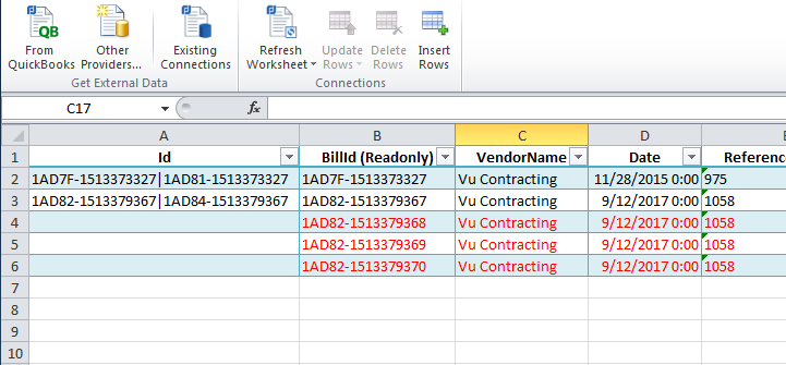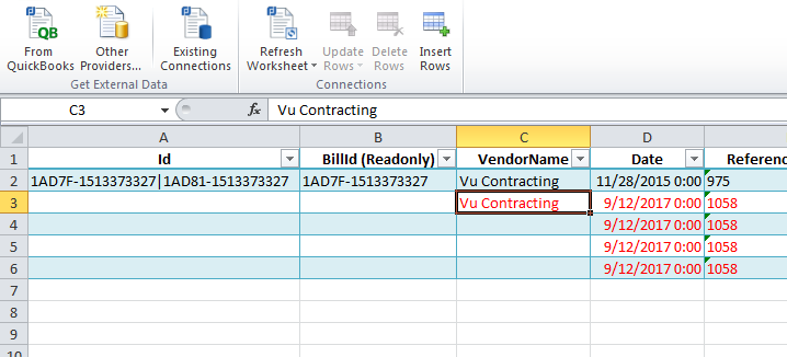 - After inserting the first row for the Bill, a BillId will be returned. To add line items to this bill, copy the BillId to any of the remaining rows associated with the same Bill. Then select these same rows and click Insert Rows button again. The rows you copied the BillId to will be appended to the same Bill as Line Items.