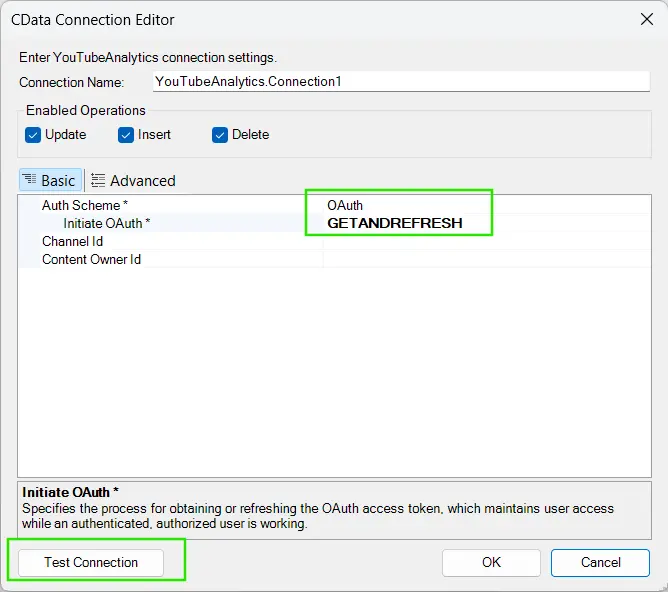 - Click on Test Connection at the bottom-left. A browser window will open prompting you to choose your Google account and YouTube channel.