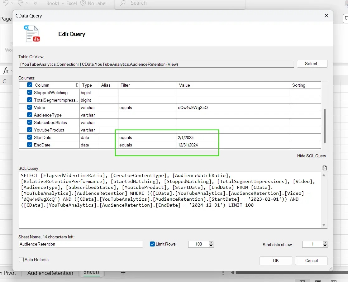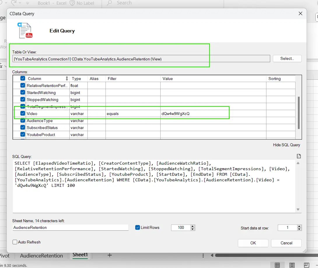 CData.YouTubeAnalytics.AudienceRetention view table from the dropdown list.