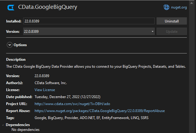 さらに、CData NuGet パッケージは公式 NuGet アカウント CDataSoftware: https://www.nuget.org/profiles/CDataSoftware からのみ公開されています。