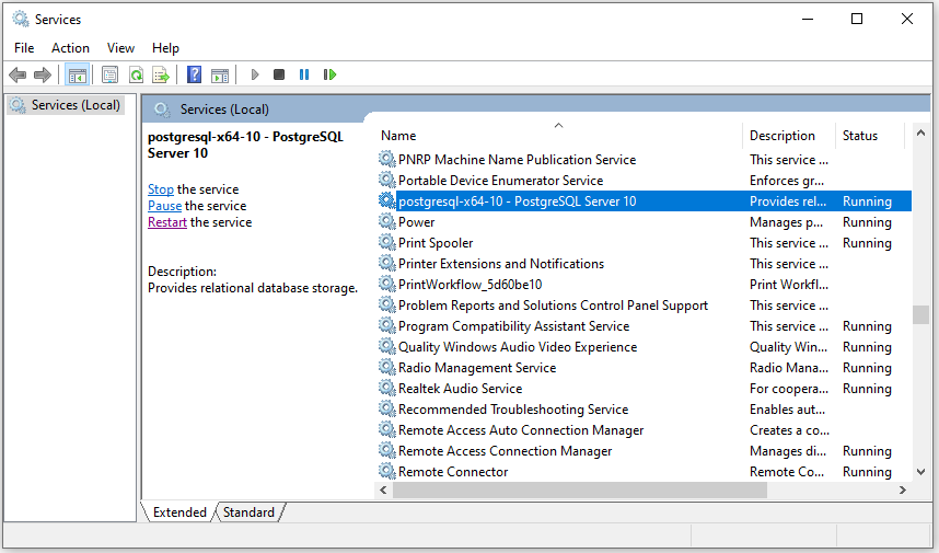 - 現在実行中のサービス一覧から、PostgreSQL サーバーのサービスを見つけて再起動します。これにより、conf ファイルで行った変更が PostgreSQL サーバーに適用されます。