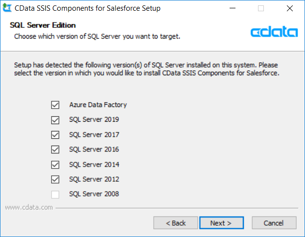 CData SSIS コンポーネントをインストールする際、そのマシンで検出された利用可能な SQL Server バージョンが表示され、インストールするアセンブリを選択できます。