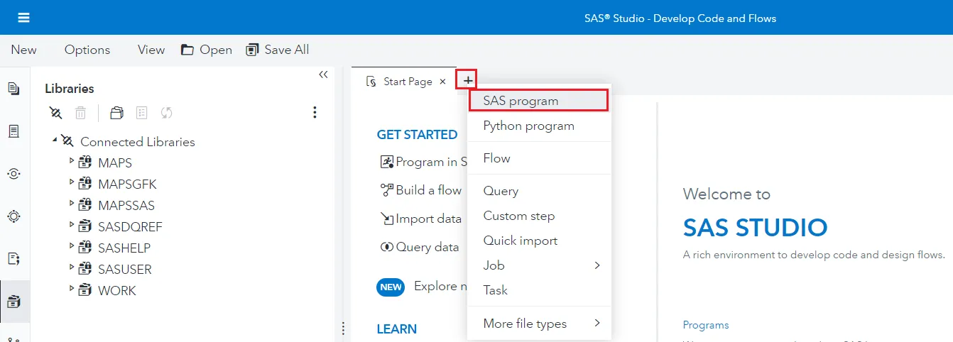 - をクリックして新しいタブを追加し、SAS program を選択します。