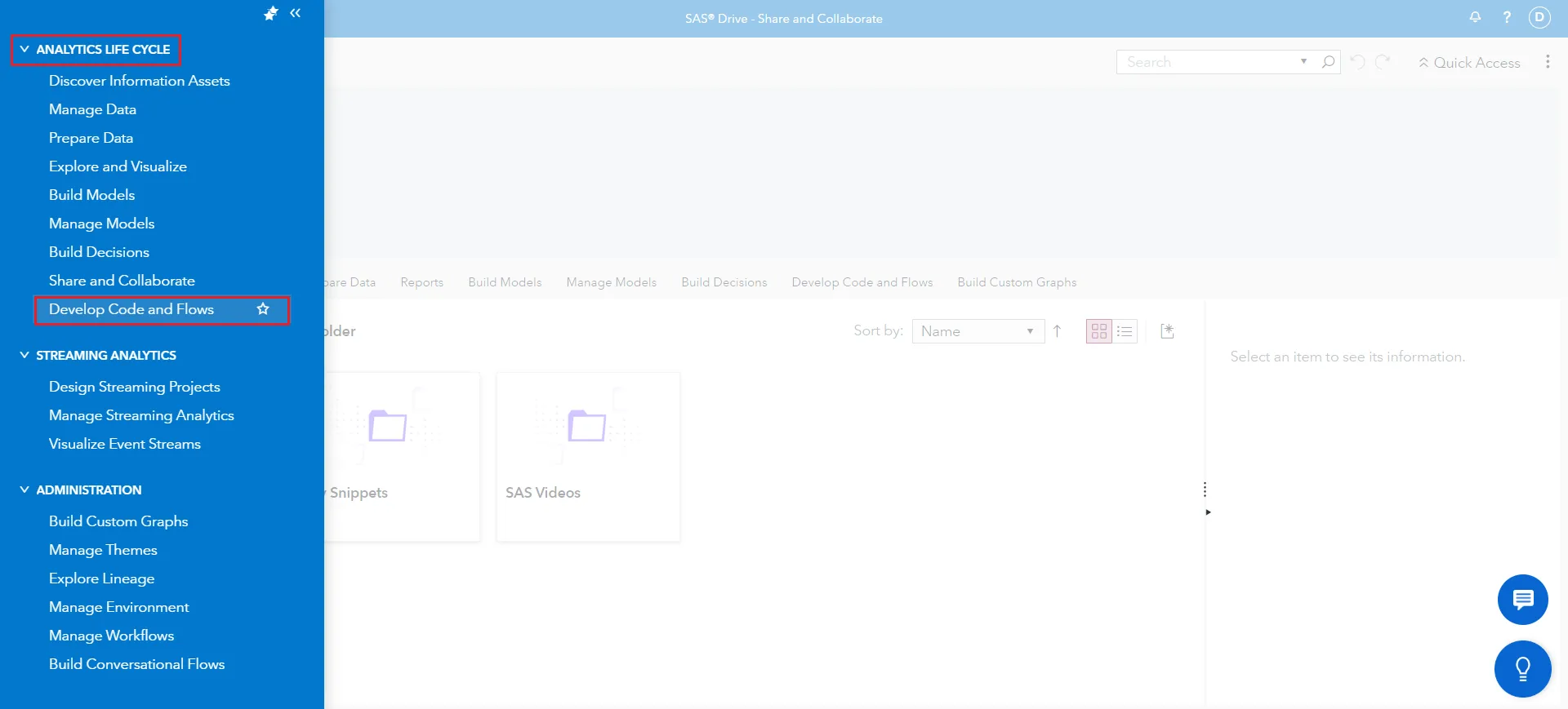 - Analytics Life Cycle トピックから Develop Code and Flows を選択します。