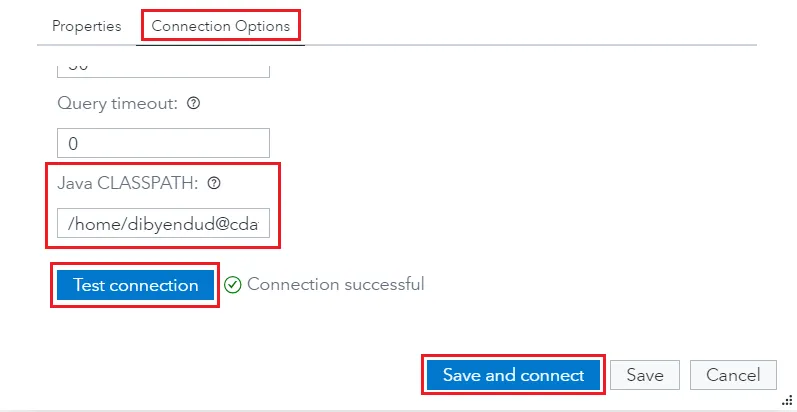 - 「Connection Options」タブをクリックし、以下の詳細を入力します。
