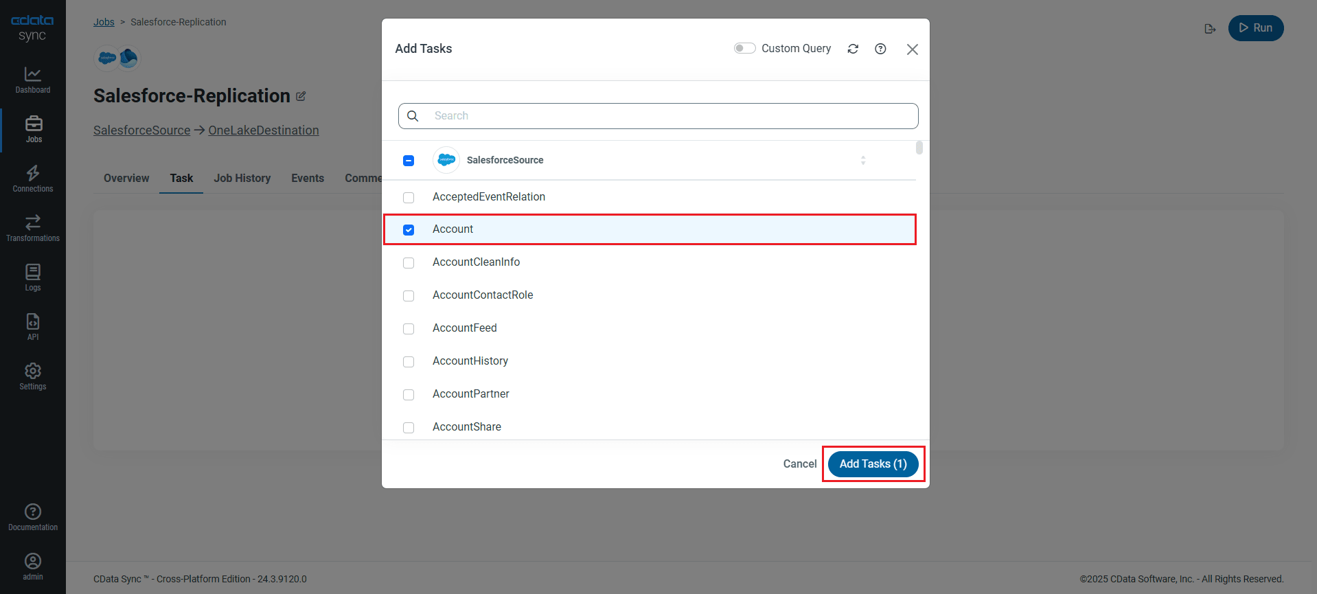 テーブル全体をレプリケーションするには、ジョブのタスクタブでタスクを追加をクリックし、OneLake にレプリケーションしたい Acumatica テーブルをリストから選択して、再度タスクを追加をクリックします。