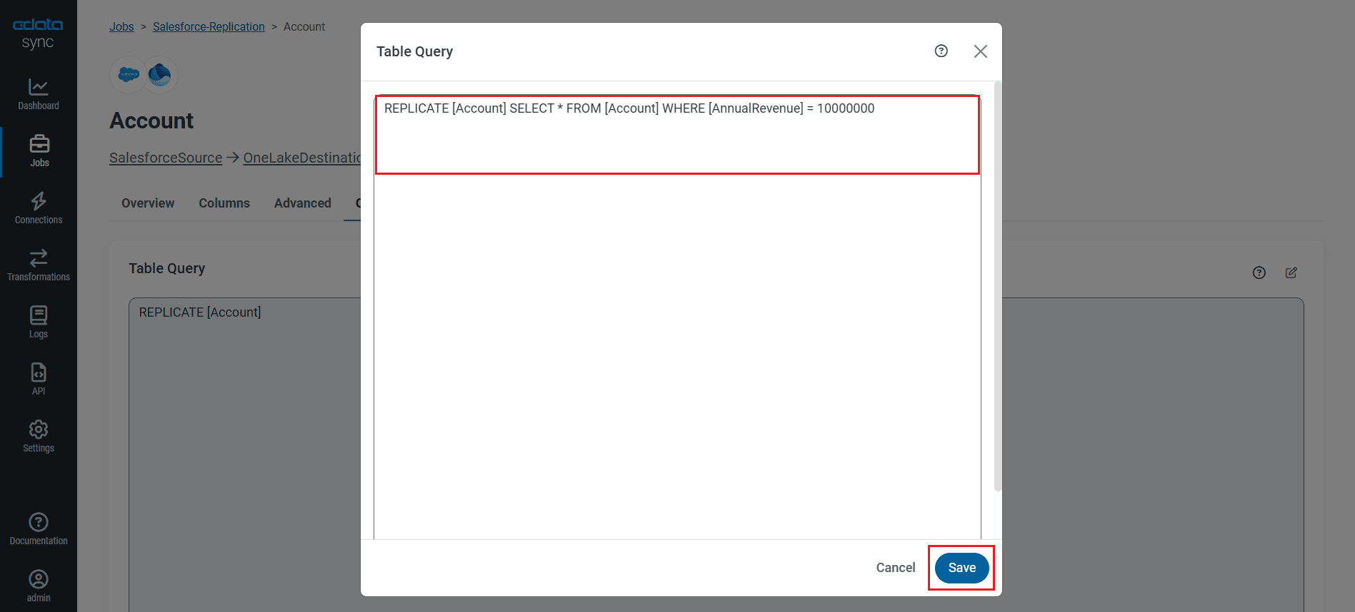 レプリケーションジョブを設定したら、変更を保存をクリックします。Acumatica のデータ から OneLake へのレプリケーションを管理するジョブをいくつでも設定できます。