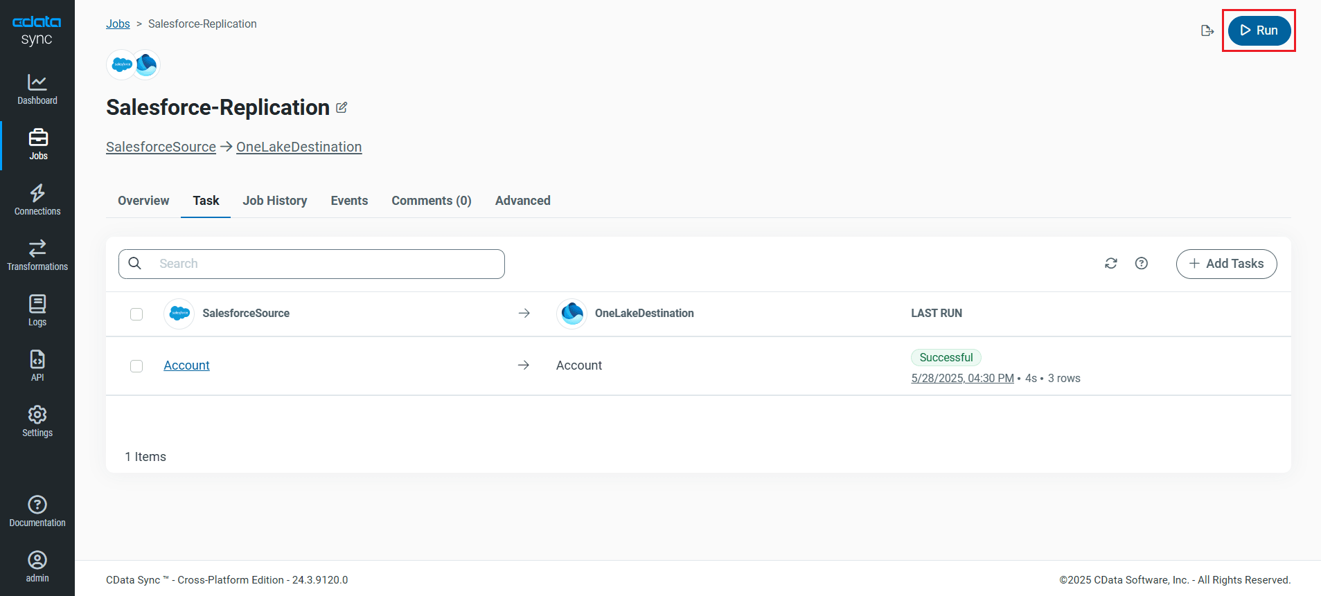 ジョブに必要なすべての設定が完了したら、レプリケーションしたい Acumatica テーブルを選択し、実行をクリックします。レプリケーションが正常に完了すると、ジョブの実行時間とレプリケーションされた行数を示す通知が表示されます。