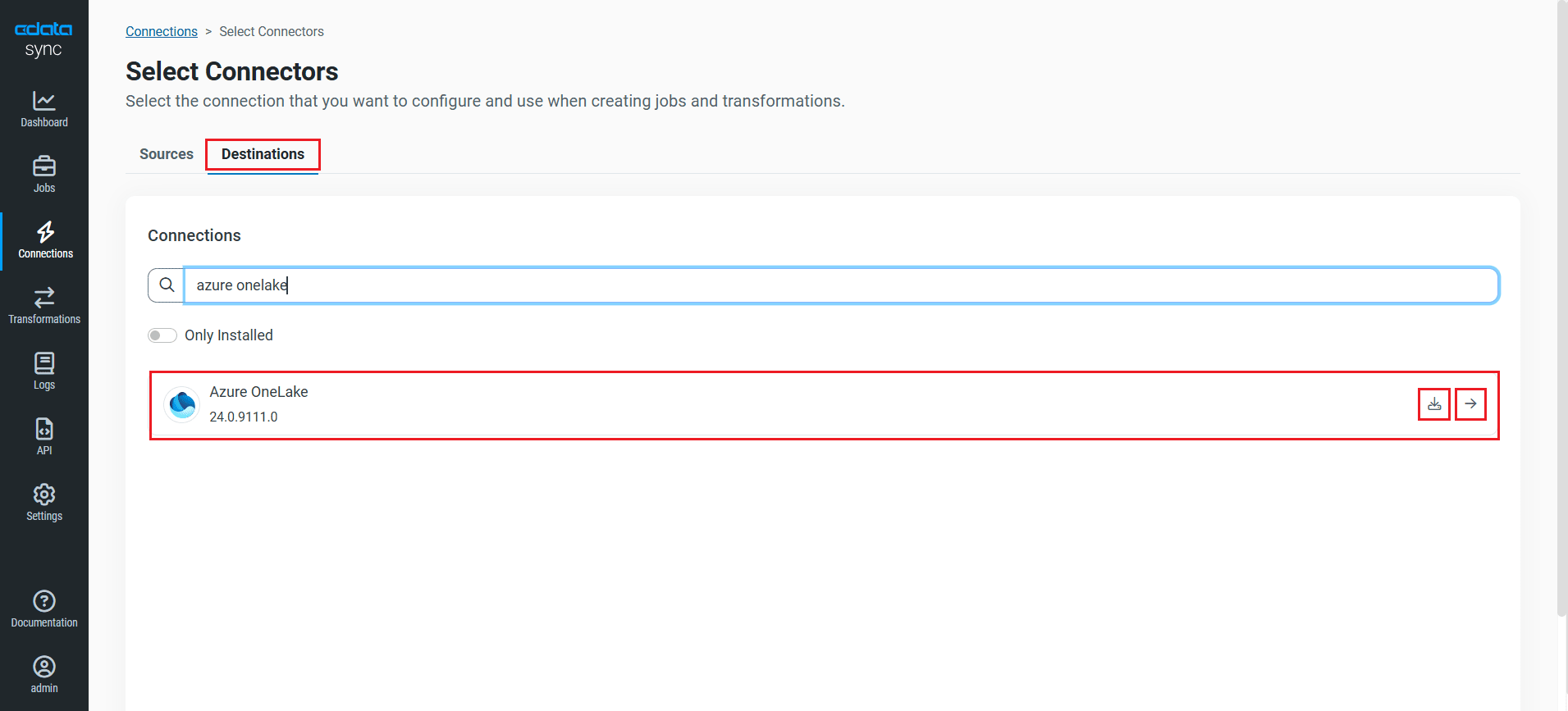 - 同期先タブをクリックし、Azure OneLake コネクタを探します。