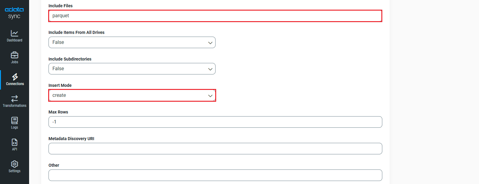 - Insert ModeドロップダウンからCreateを選択します。その他の Insert Mode オプションにはOverwriteとBatchがあります。