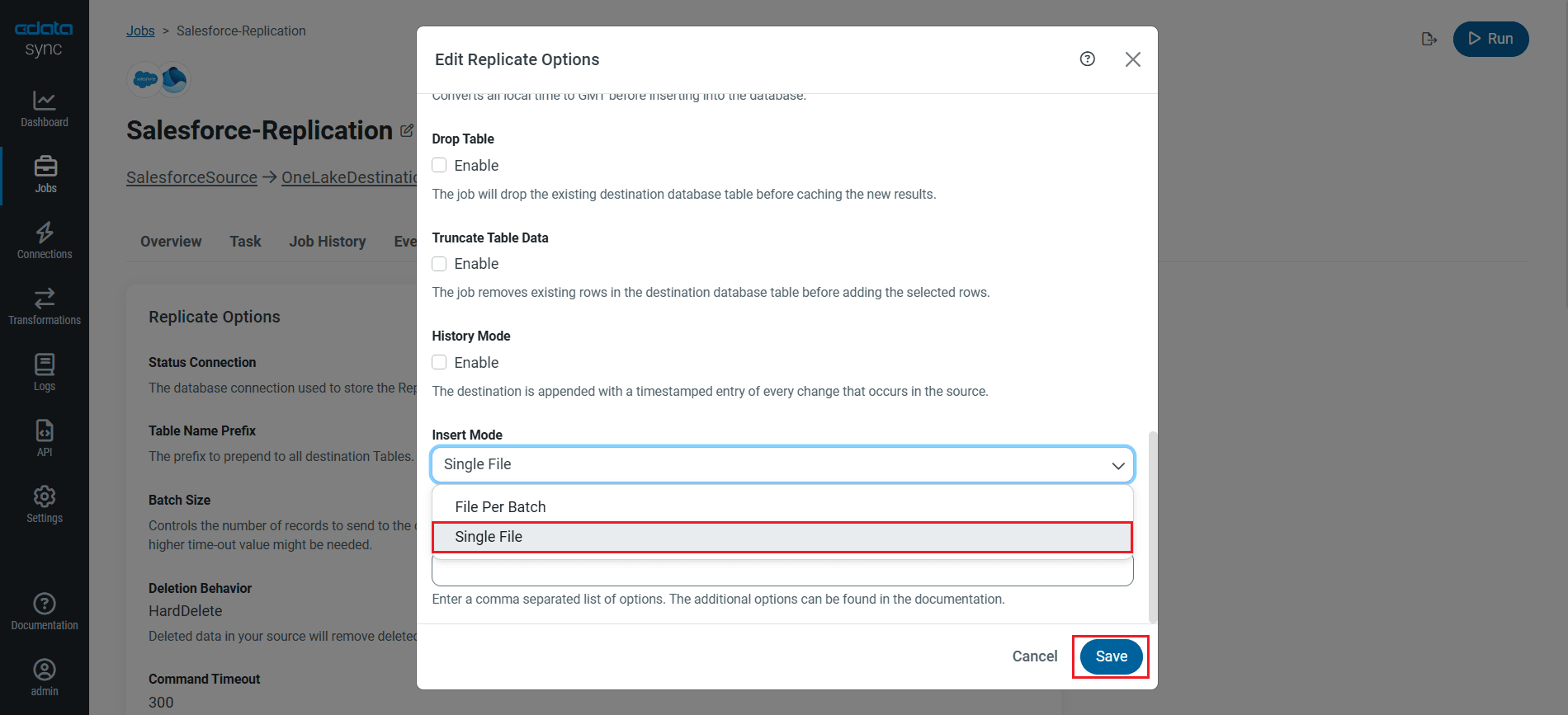 - ジョブの詳細タブで、レプリケーションオプションの編集をクリックし、Insert ModeをSingle Fileに設定します(OneLake コネクタで Insert Mode を「Create」に設定した場合)。