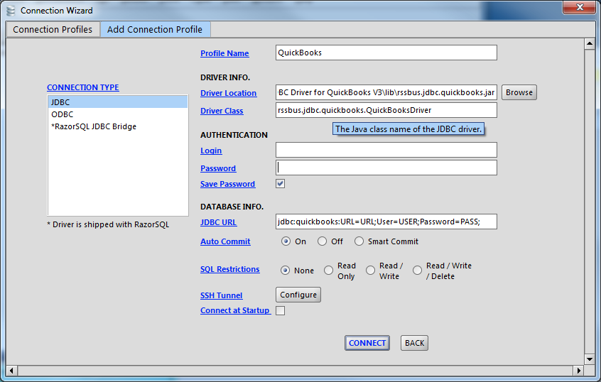 - RazorSQL アプリケーションを開き、「Connections」メニューから「Add Connection Profile」->「Other」->「JDBC」を選択します。