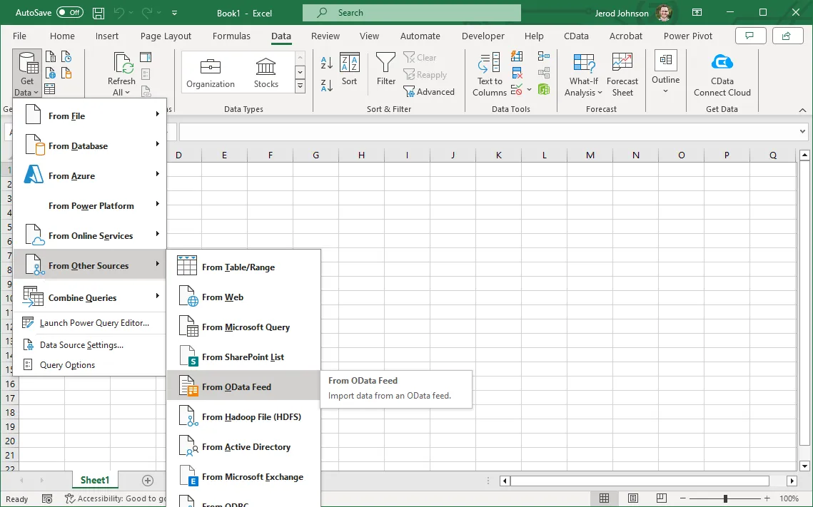 Excel で「データ」→「データの取得」→「その他のソースから」→「OData フィードから」をクリックします