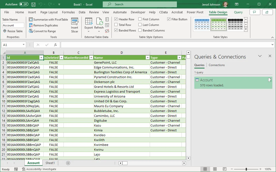 テーブルを選択して「読み込み」をクリックすると、Excel スプレッドシートにデータが表示されます