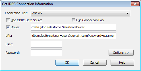 - Get JDBC Connection Information ダイアログで、JDBC ドライバーへの接続を設定します。