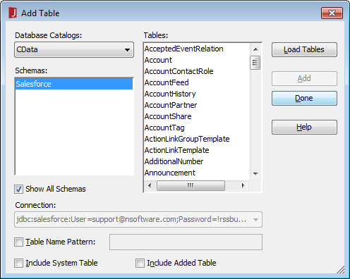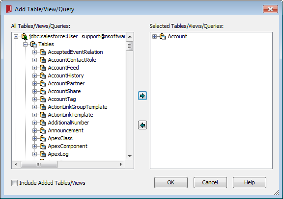 - Add Table/View/Query ダイアログで、JDBC URL と Tables を展開()し、クエリで使用するテーブルを選択して OK をクリックします。